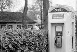Shallow focus of a well-maintained privet hedge seen in a city centre. An old telephone box is seen as a now converted cash machine adjacent to the hedge.