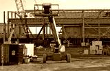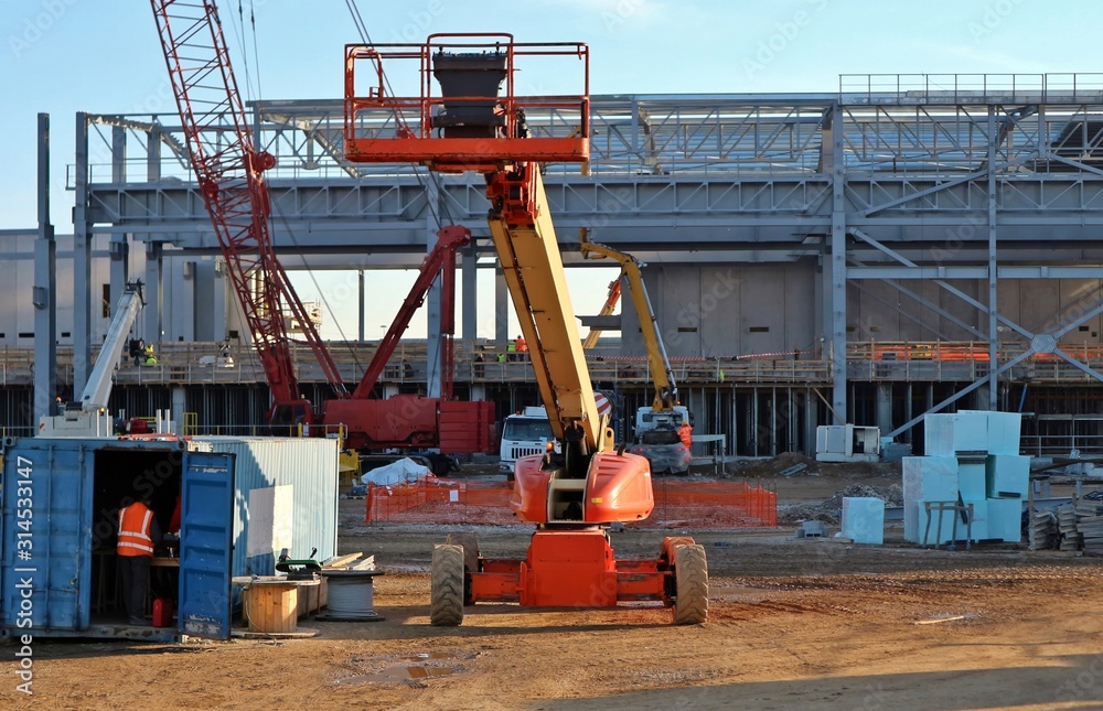 Front view of cherry picker. On background a building under construction and several machinery and men at work