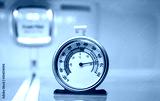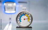 Refrigerator thermometer in empty cold storage unit. Refrigeration safety gauge displaying unsafe food temperature warning.