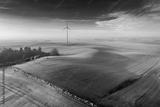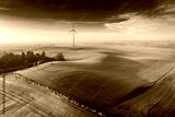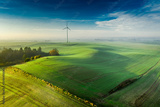 Wind turbine on foggy green field at sunrise