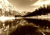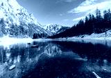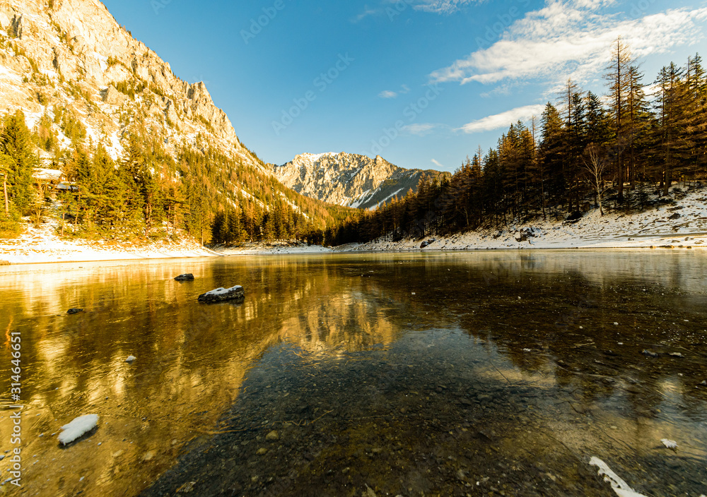 Peaceful mountain view with famous green lake in Austria Styria. Tourist destination lake Gruner See in winter. Travel spot situated in Tragos in lime stone Alps of Hochschwab.