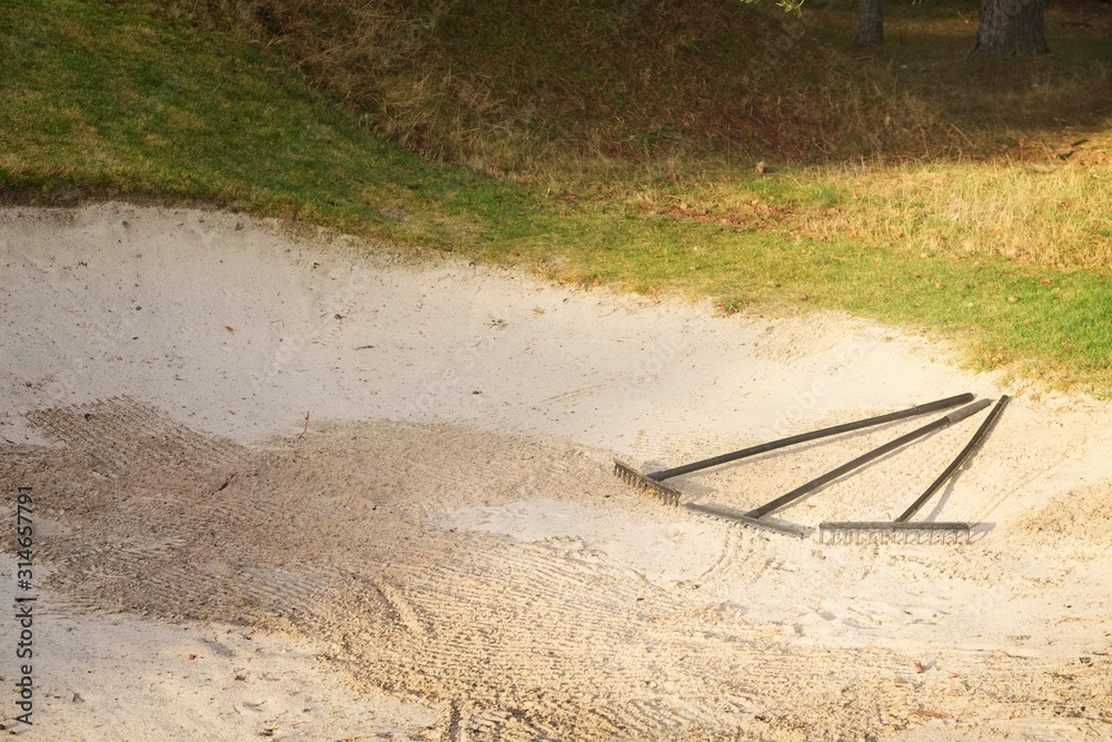 Rake in sand bunker at golf links course green for golfers