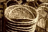 Empty wicker baskets in view in a market place