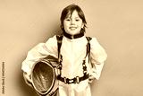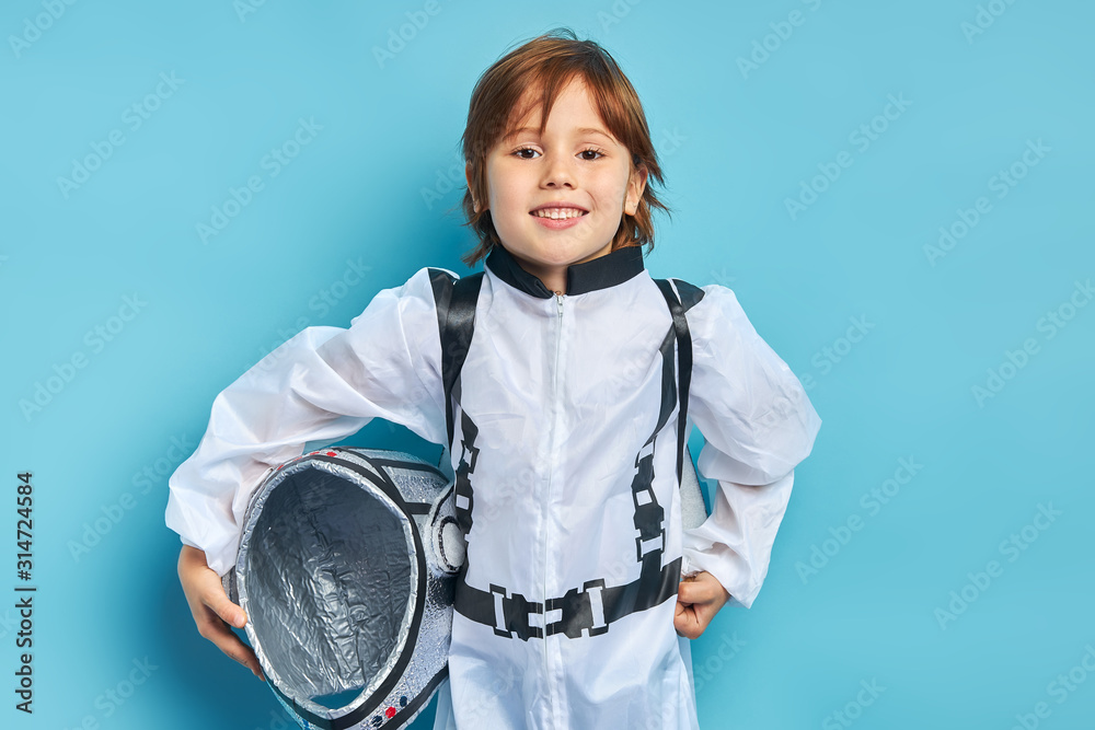 Portrait of cute caucasian boy wearing white protective suit and holding helmet stand isolated over blue background. look at camera