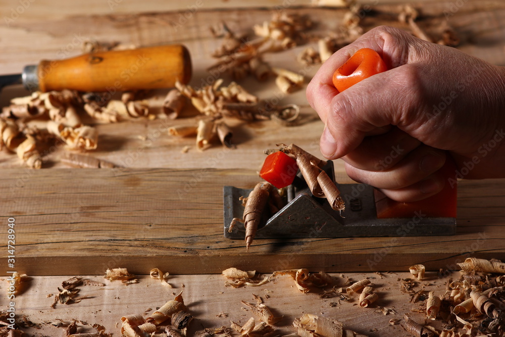 the process of planing a wooden board with a hand plane in a carpenter's workshop