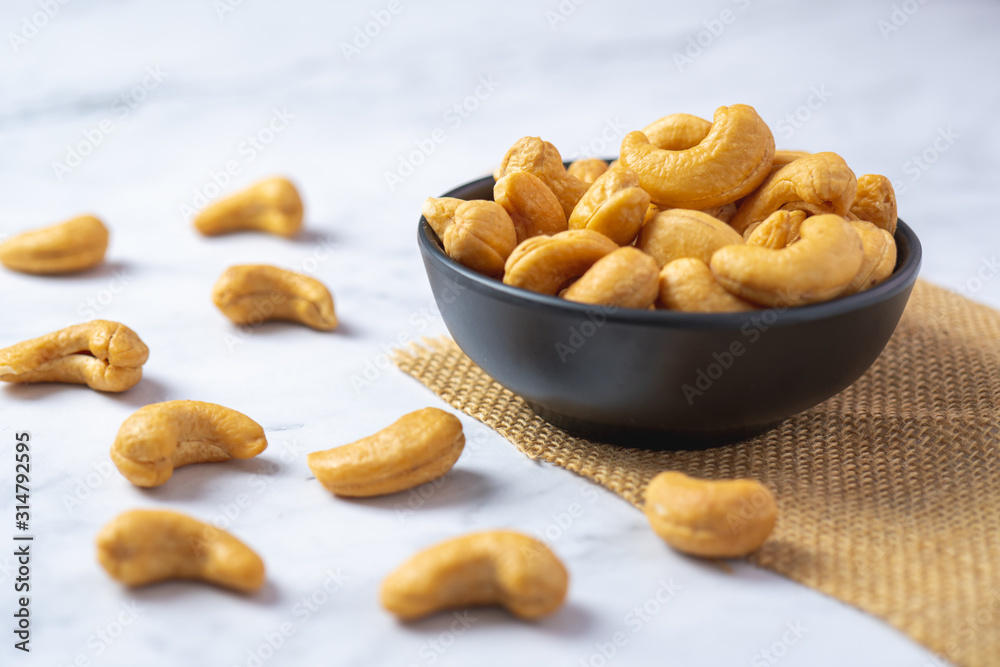Top view of roasted cashew nut in salt in black bowl on white marble floor
