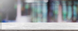 Empty white marble stone table top and blur glass window interior restaurant banner mock up abstract background - can used for display or montage your products.