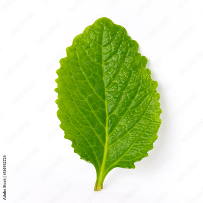 Studio shot one green leaf of Mexican mint isolated on white organic medical herb