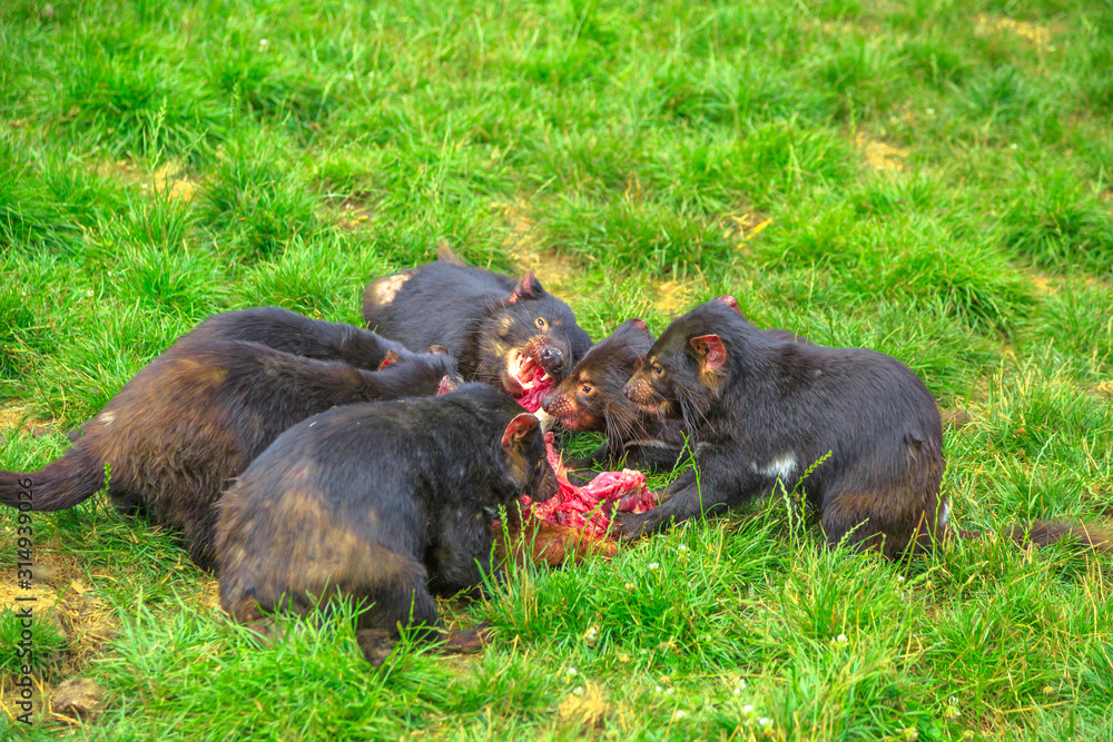 Group of Tasmanian Devils, Sarcophilus harrisii, tear down a carcass of dead animal with ferocity and aggravation in nature. Marsupials Wildlife of Tasmania, Australia.