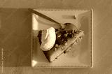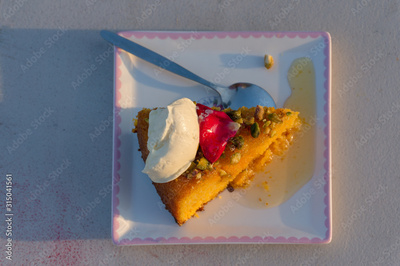 Top view of slice of sweet cake with cream and pistachio nuts and rose petal