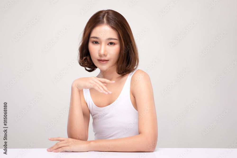 Beautiful Asian woman with short hair looking at camera smile with clean and fresh skin Happiness and cheerful with positive emotional,isolated on gray background,Beauty and Cosmetics Concept
