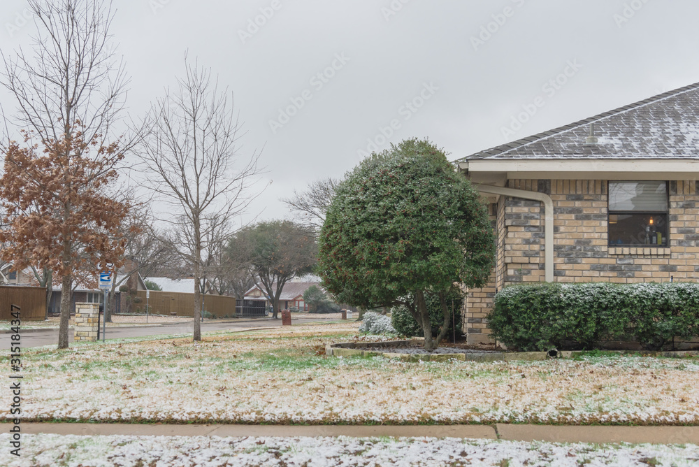 Typical residential house in snow cover near Dallas, Texas, USA