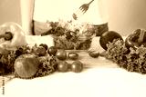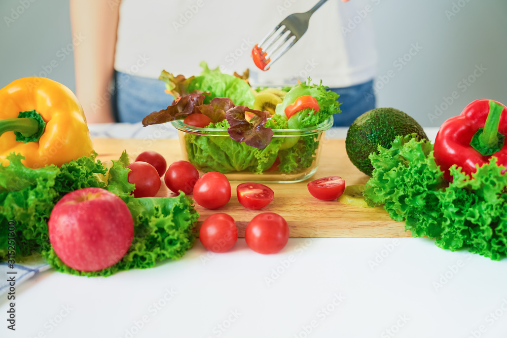 Close-up of woman hands showing salad bowl and various green leafy vegetables on the table at the home.