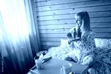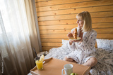 Young pregnant woman eat a croissant in the bedroom