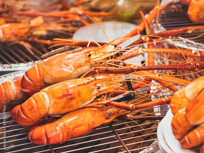 Street food Grilled shrimp bbq seafood Food stall Bangkok Thailand