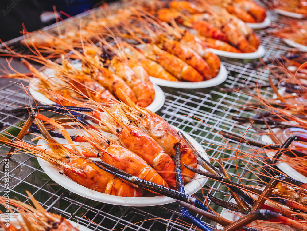 Street food Grilled shrimp on plate Seafood menu Food stall Bangkok Thailand