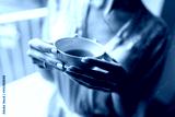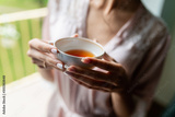 Close-up of a beautiful Cup of tea with a drawing in the hands of a girl in a soft pink robe. Cup in women's hands on the background of a bust in a white coat in the morning in a cozy hotel room