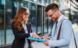 Conversation about projects. Business people in front of the corporation put signature on contract. Business, lifestyle concept