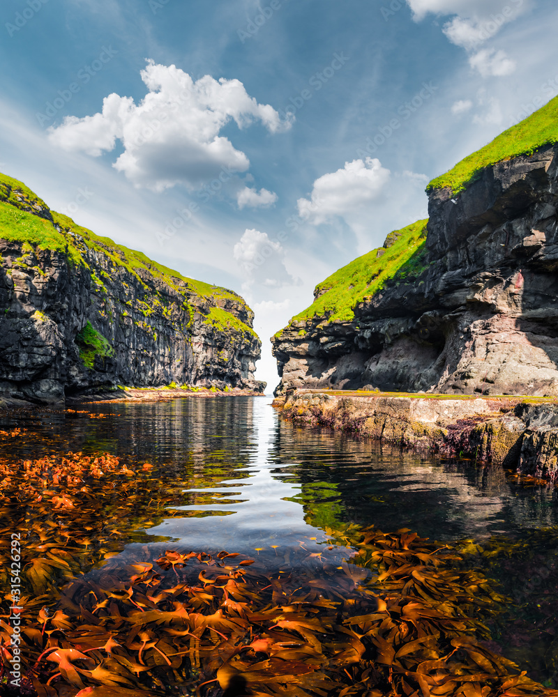 Beautiful view of dock or harbor with clear water and red seaweed in Gjogv village, Eysuroy island, Faroe Islands, Denmark. Landscape photography