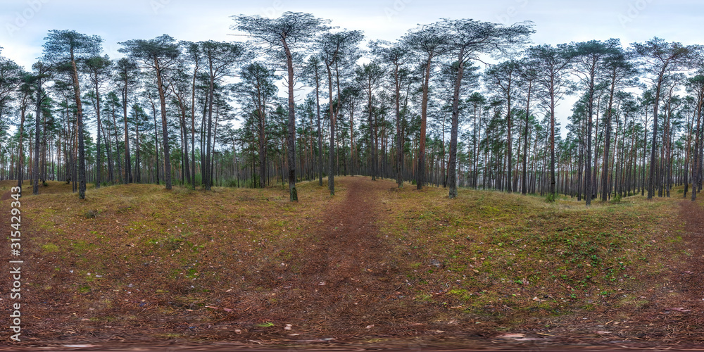 full spherical hdri panorama 360 degrees angle view on pedestrian footpath and bicycle lane path in pinery forest in overcast weather in equirectangular projection. VR AR content