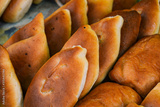 Homemade baking. Traditional Russian pies with cabbage, egg or meat. Fresh baked pasties and pastry rolls close-up. Food for breakfast, dinner or lunch