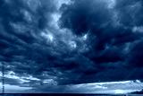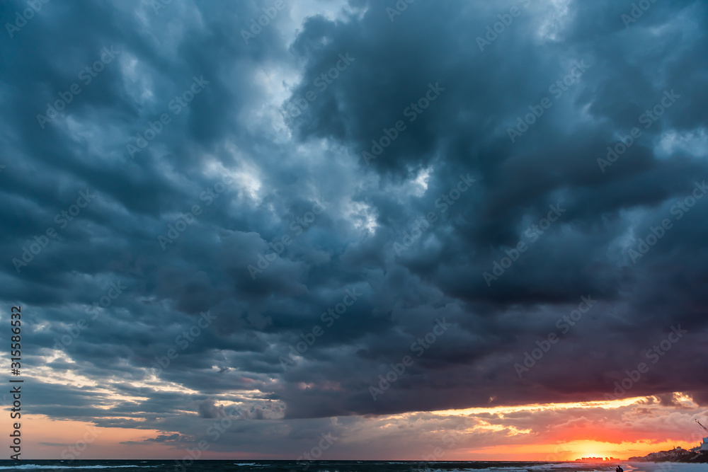 Dramatic dark orange red sunset cloudscape skyscape in Santa Rosa Beach, Florida with Pensacola coastline coast skyline in panhandle with ocean gulf mexico