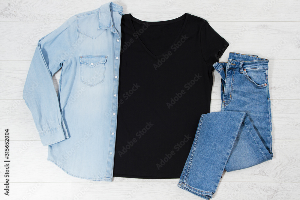 Black closeup t shirt mock up flat lay on white wooden background. Top view and copy space. Mockup t-shirt and summertime. Template blank shirt.