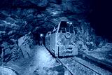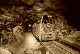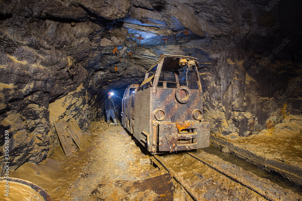 Underground gold mine shaft tunnel drift with old electric locomotive