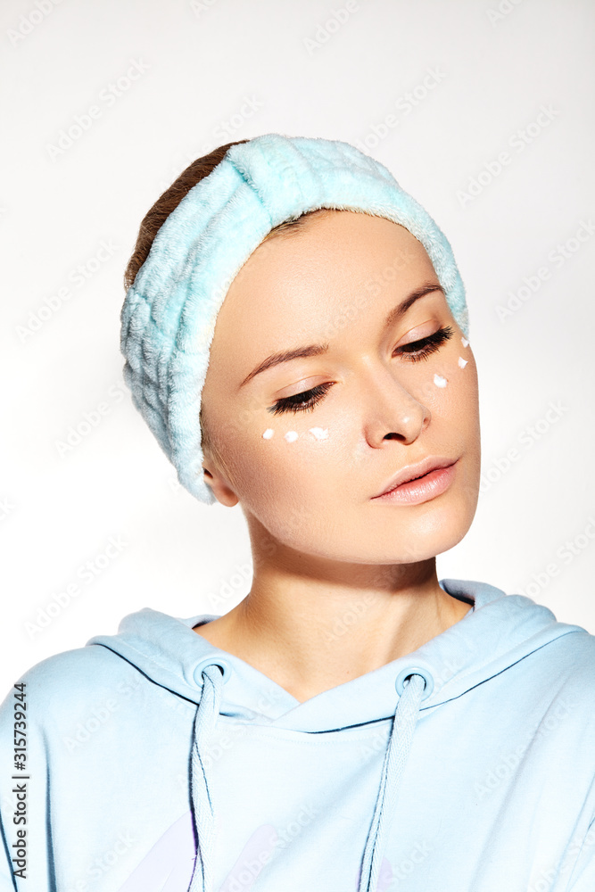 Woman Applying Beauty Skin Cream. Wrinkle Cream or anti-aging Skin Care Moisturizer. Daily Morning Face Care Routine