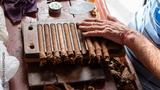blue dressed man rolling / making handmade cigars in vinales, cuba