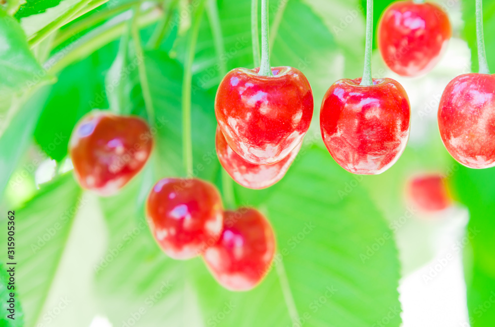 Shallow DOF focus fresh cluster of red and ripe cherries hanging branch blurry background