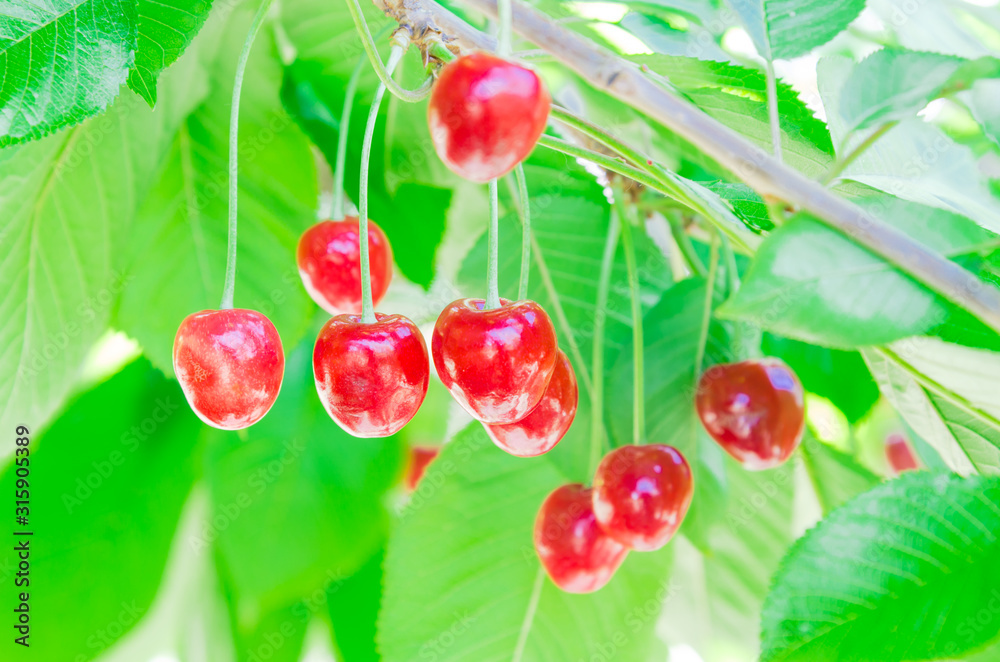 Shallow DOF focus fresh cluster of red and ripe cherries hanging branch blurry background