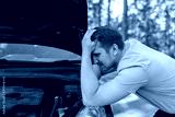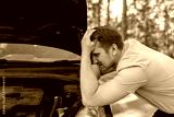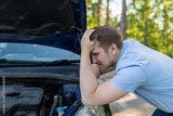 A sad man bowed his head over a broken car with an open hood on the side of the road. A man holds his head in despair next to his car.
