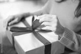 Woman opening gift box over living room.