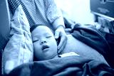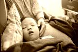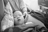 Cute little Asian 3 years old toddler boy child sleeping on airplane, Kid sleeping on mother's laps during the flight by plane, Flying with children concept - Soft & Selective focus