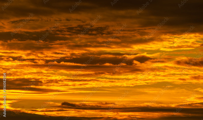 Beautiful sunset sky. Golden sunset sky with beautiful pattern of clouds. Orange, yellow, and dark clouds in the evening. Freedom and calm background. Beauty in nature. Powerful and spiritual scene.