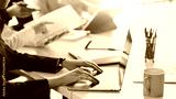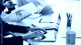 Close up view of business typing on laptop while siting in meeting room with co worker and office supplies