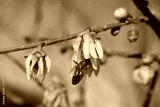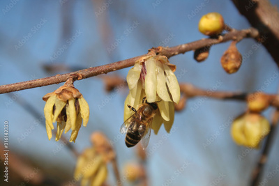 Honey bee collecting nectar on a Chimonanthus praecox or Calycanthus bush in bloom. Apis mellifera on yellow flowers of Wintersweet bush