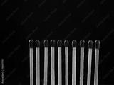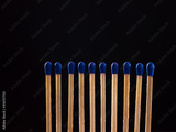 Blue matchsticks in black background. Empty with copy space for ad text. Top view, flat tile