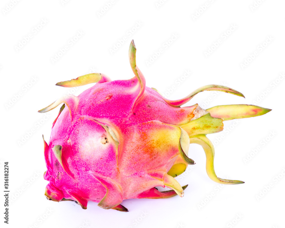 Studio shot one dragon fruit exotic tropical pitaya cactus species isolated on white