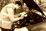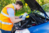 Mechanic in an orange vest with a diagnostic tablet checks the car engine. scheduled maintenance and diagnostics of the car engine. Mechanic With Digital Tablet Showing Graph While Examining Car