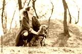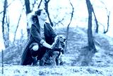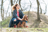Attractive young curly woman with her brown cocker spaniel posing in the park