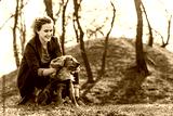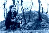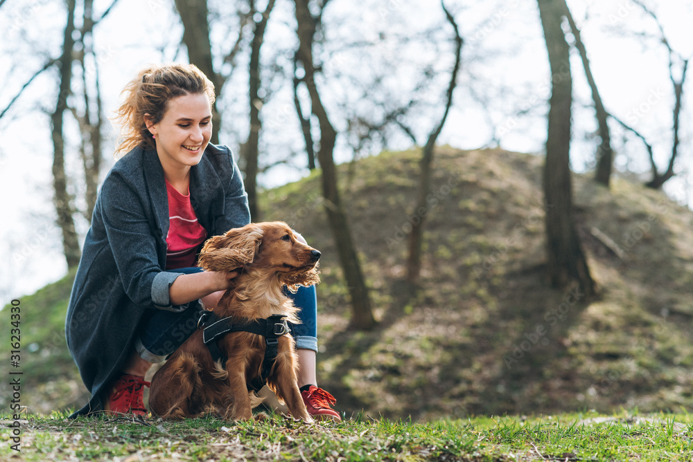 Candid photo of attractive young curly woman with her brown cocker spaniel posing in the park