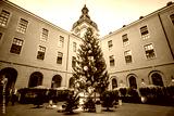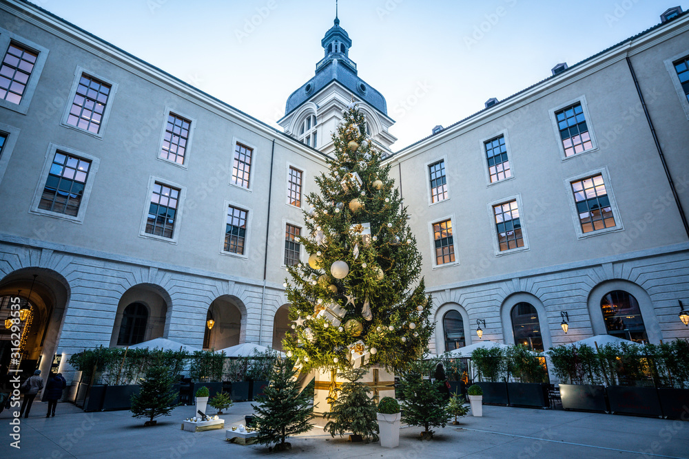 Giant illuminated Christmas tree in Saint-Martin courtyard of Grand Hotel Dieu Lyon France