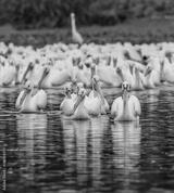 Hundreds of white pelicans swim toward camera