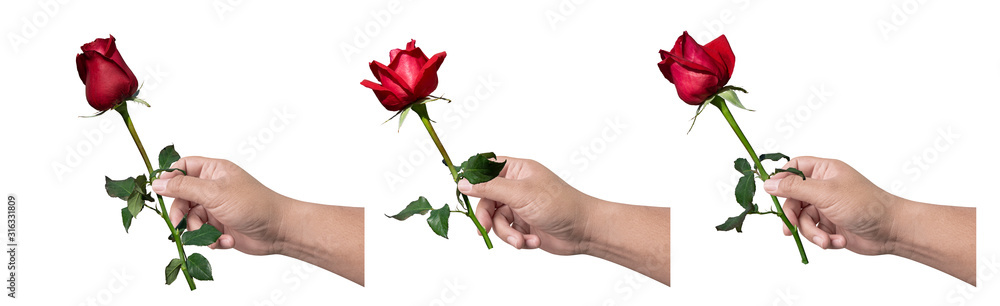 Giving a beautiful rose red. Hand holding bouquet of red roses isolated on white background. Love concept Valentine's Women's day. St. Valentine's day.