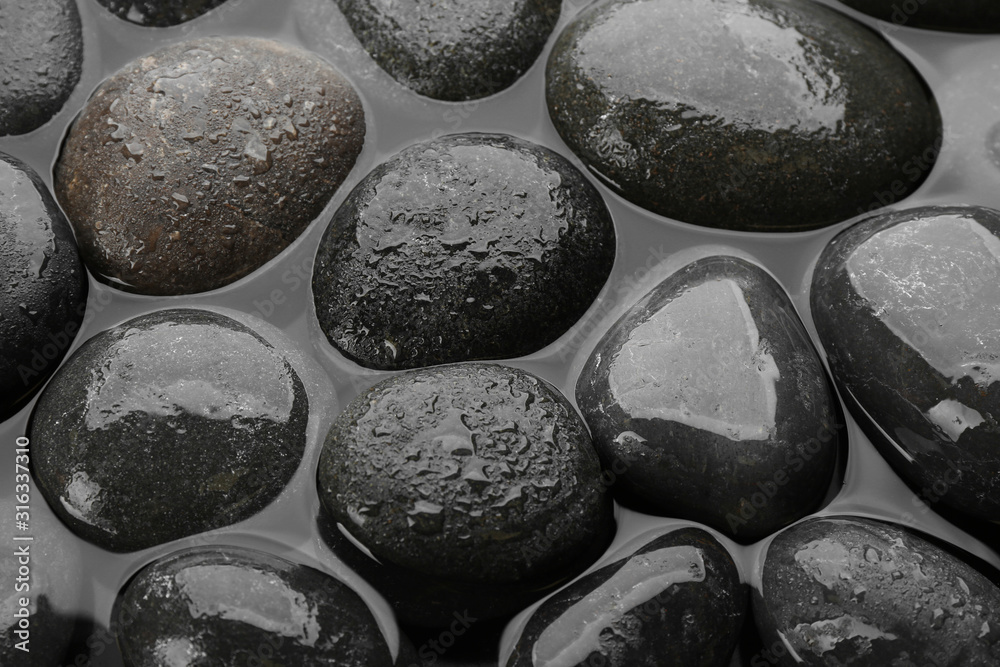 Spa stones in water as background, top view. Zen lifestyle