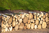 Chopped wood logs for sale use in fire place at home stored on forest woods green biomass energy