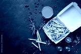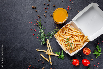 Fast food delivery concept. Fried fries in a white box of eco paper. A glass of lemonade. background image, copy space text