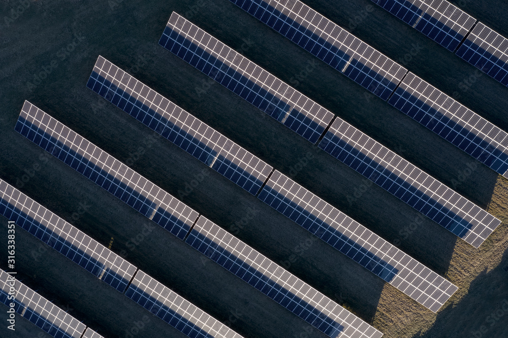 Solar PV heat panel technology in field illuminated. by sunlight by low sun at sunrise